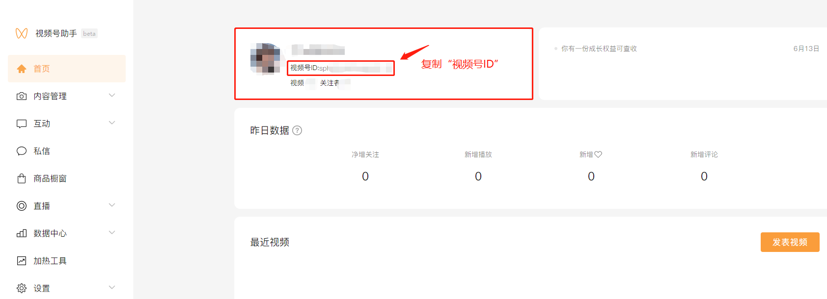 视频号ID:微信扫码登录【视频号助手】https://channels.weixin.qq.com,点击复制头像下方的视频号ID,粘贴至视频号ID处,点击确定,即向该视频号发去合作邀请。