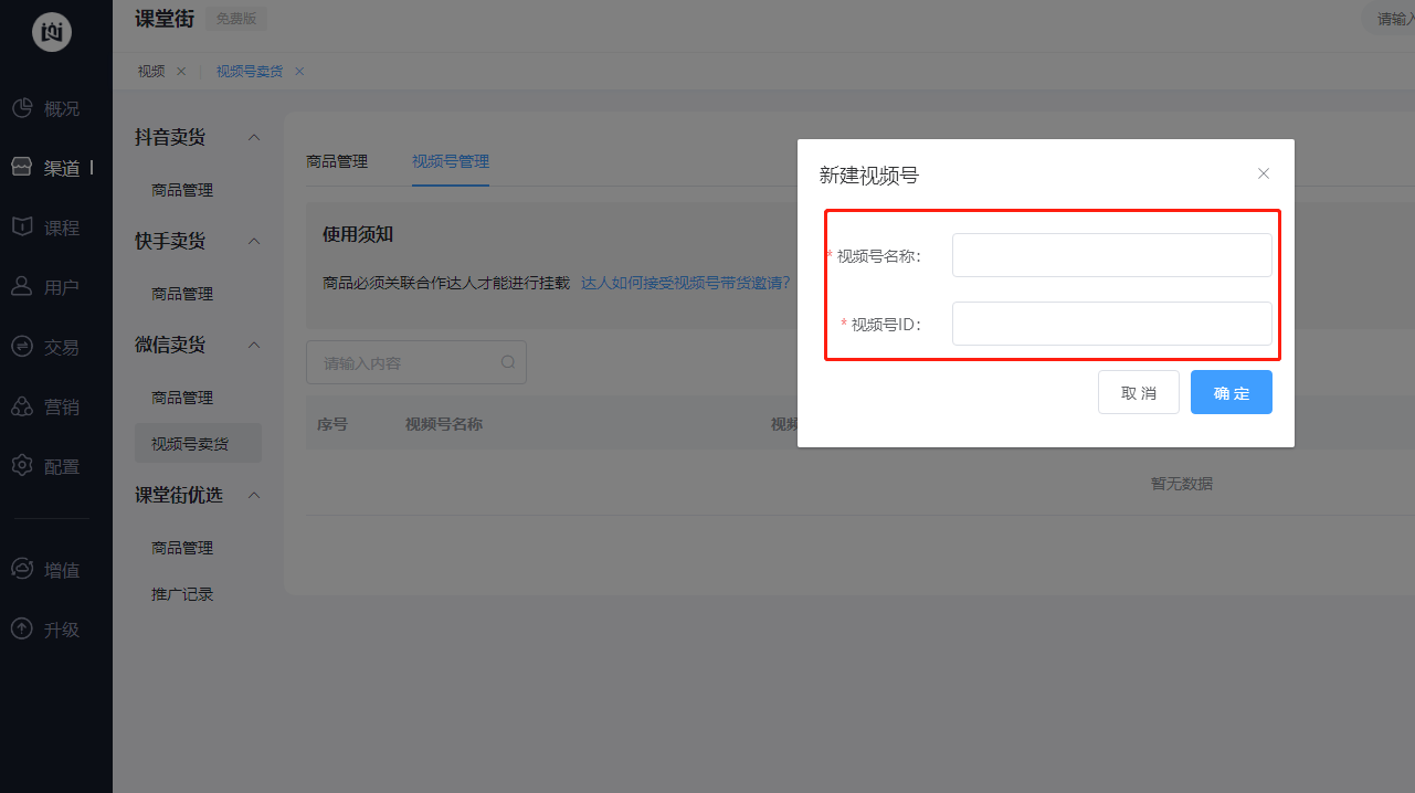 进入课堂街后台,点击【渠道】→【微信卖货】→【视频号卖货】→【视频号管理】页面,点击【添加视频号】新建视频号: